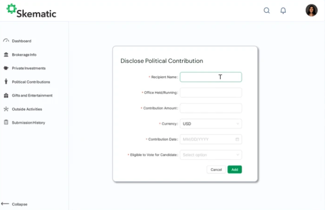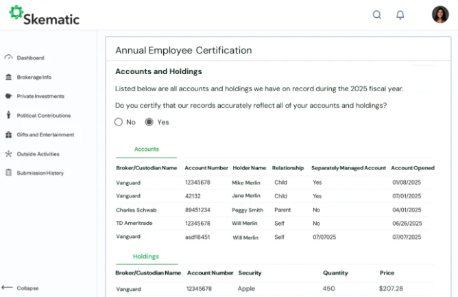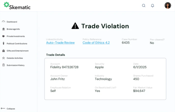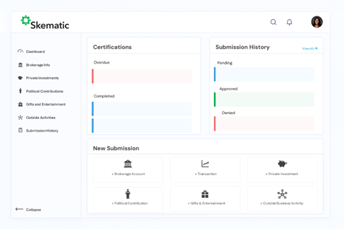 Skematic modernizes employee compliance with direct broker APIs, automated workflows, and a modern interface your team will actually enjoy using. Manage preclearance, disclosures, certifications, and trade monitoring — all in one unified, audit-ready system.