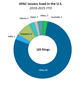 There were 105 actions against APAC-domiciled companies from 2019 through May 1, 2025, the vast majority of which were against Chinese companies. That’s 82 out of 280 Chinese companies that have been sued in U.S. class actions, or nearly 30% of all Chinese companies trading through ADRs on U.S. exchanges.