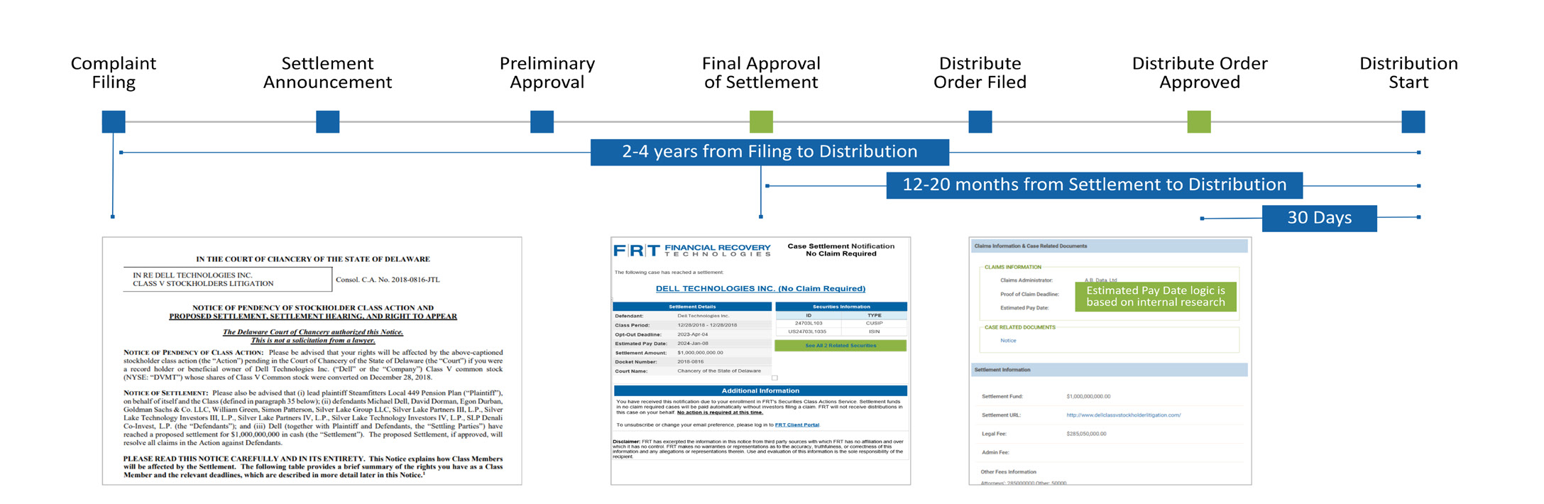 Advance settlement notification allows investors to track case progress and plan for future recoveries. Knowing when a distribution order is court-approved signals that payment will begin soon, giving investors valuable lead time for allocation work. Lastly, identifying whether the NCF payment will come from the DTCC or a claims administrator allows investors to prepare their systems to accept the incoming funds and, if necessary, reach out to verify that payment and address information are up to date.